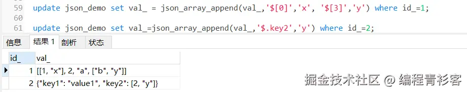 update json_demo set val_ = json_array_append(val_,'$[0]','x', '$[3]','y') where id_=1;