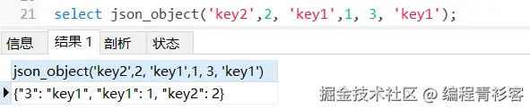 select json_object('key2',2, 'key1',1, 3, 'key1');