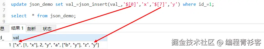 update json_demo set val_=json_insert(val_,'$[0]','x','$[7]','y') where id_=1;