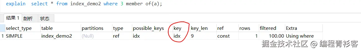 这里查询a列中包含3的记录,通过执行计划可以发现member of()函数使用了多值索引idx: