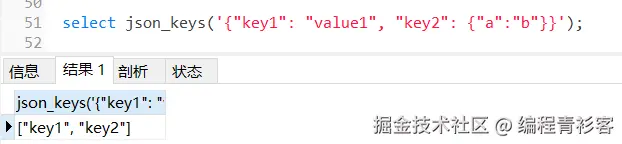 json_extract()函数返回的都是JSON对象的值,如果想返回键,则需要用json_keys()函数。json_keys()会以JSON数组的形式返回JSON对象中顶层的键,即将所有的键组成一个数组返回。语法如下: