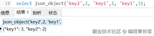select json_object('key2',2, 'key1',1, 'key1',3);