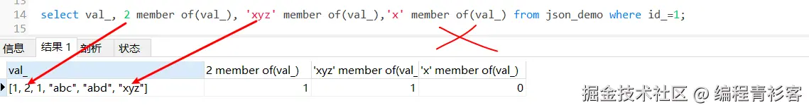 对于JSON数组,如果只是想知道某个值是否存在,还可以用value member of(json_array)来判断值是否包含在指定数组中(MySQL 8.0.17后可用),包含返回1,不包含则返回0: