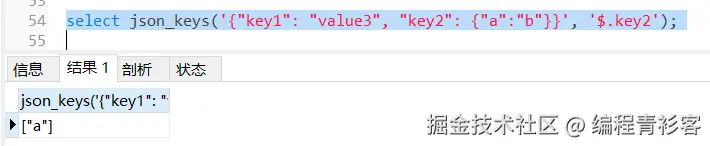 json_keys(json_doc [, path]),当提供path参数时(JSON对象嵌套),会返回指定path处元素的顶层键。