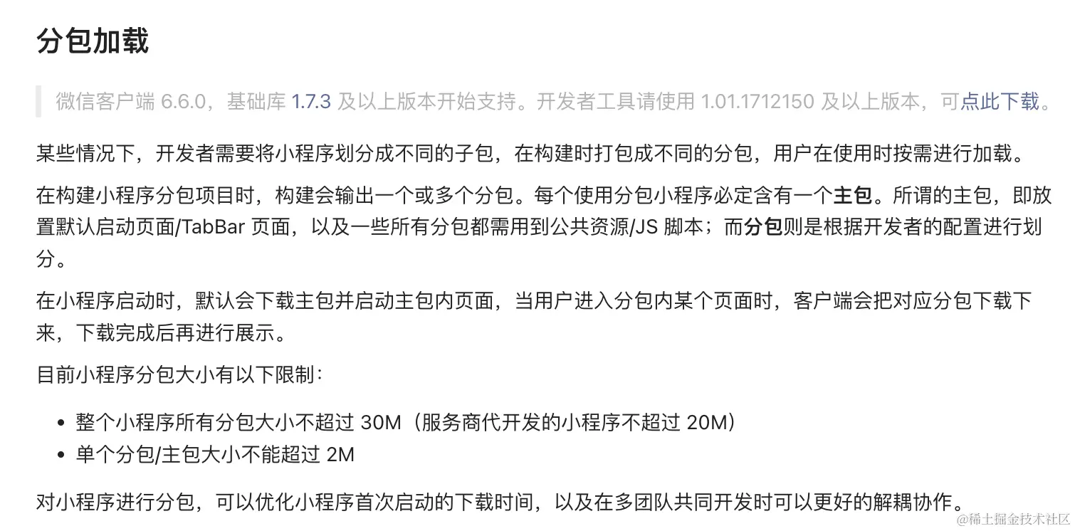 做过小程序开发的同学可能都知道,为了减小小程序的包体积,通常会将小程序进行分包,即将非首屏的模块和页面放在子包 subPackages 中,这样就可以实现进入时按需加载。