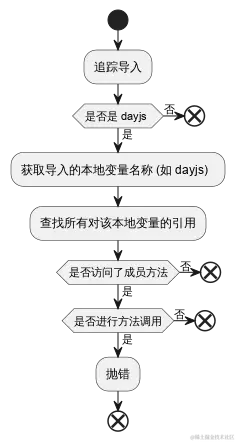 不难看出其中有 ImportDeclaration 导入声明、MemberExpression 成员表达式,CallExpression 调用表达式等节点。我们可以利用 ImportDeclaration 来追踪 dayjs 的导入,使用 MemberExpression 来追踪成员访问方法,使用 CallExpression 来追踪方法调用,大体流程如下: