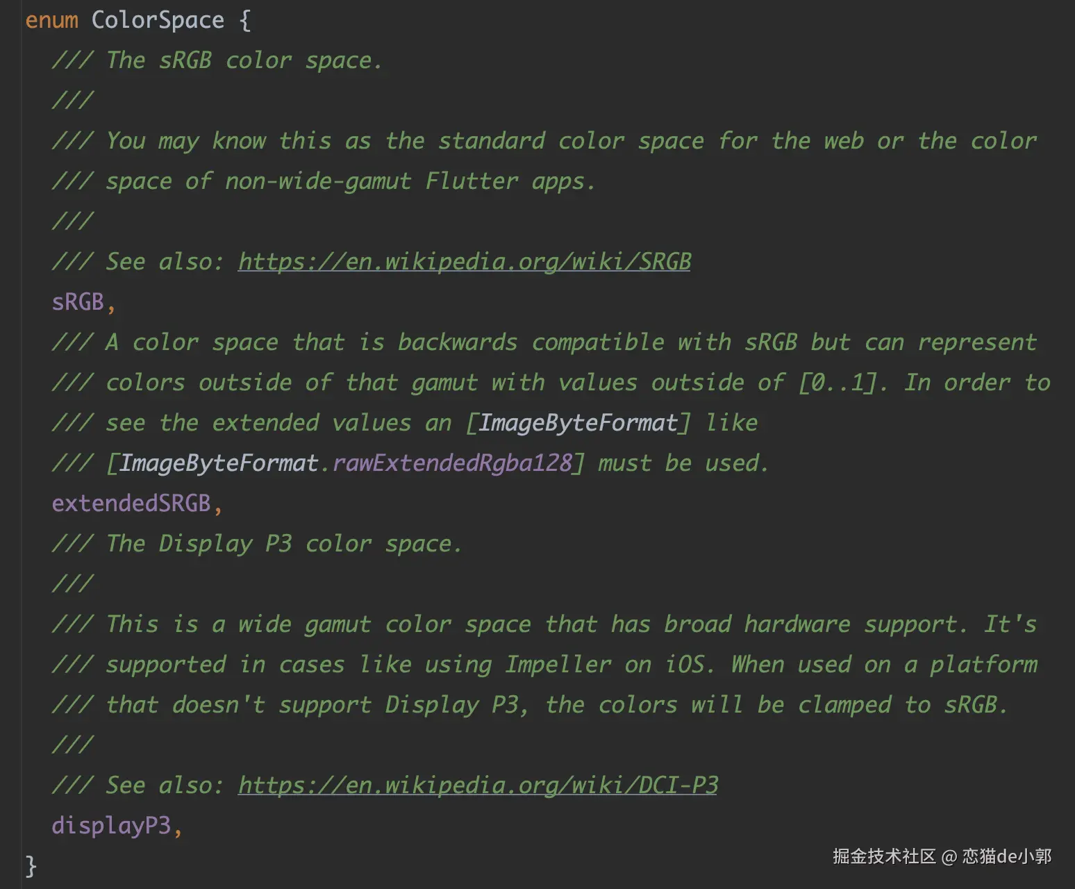当然, 3.10 中 Flutter 只是为 Impeller 开启了图像渲染是的广色域支持,对于使用 Color 类 API 的情况,依然还停留在 sRGB 下,它没有对在 Flutter Widget 中渲染广色域提供 API 的支持。