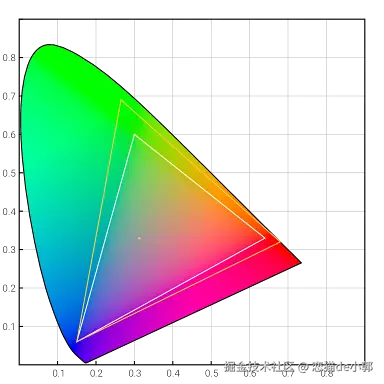 简单看下如下图所示 sRGB(白色三角形)与 Display P3(橙色三角形)的色域对比,从比例上说,P3 广色域可以比 sRGB 多出至少 25% 的颜色支持。
