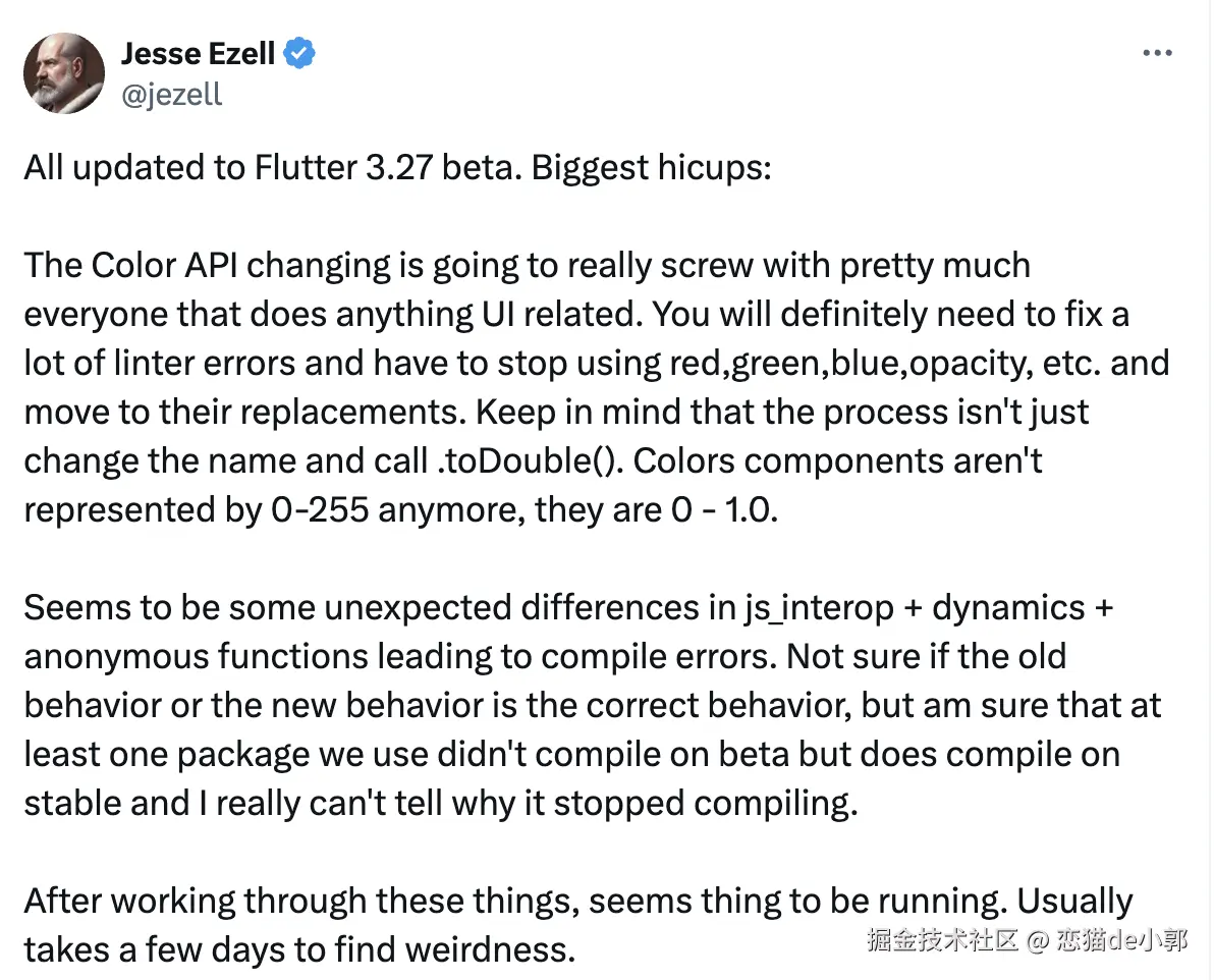 事实上,本次调整虽然看起来就像是一个简单的 toDouble 过程,但是它对于 Flutter 的 UI 影响确实不小,不管是颜色 API 的适配,还是计算方式的变化,甚至是色域的支持等场景,如果单从影响效果看,这个合并可以说是影响广泛,整出边界渲染问题其实并非不可能,所以这个合并也是憋了这么久才被合并到 beta ,也许不久之后,我们就可以在正式版本中看到它了。