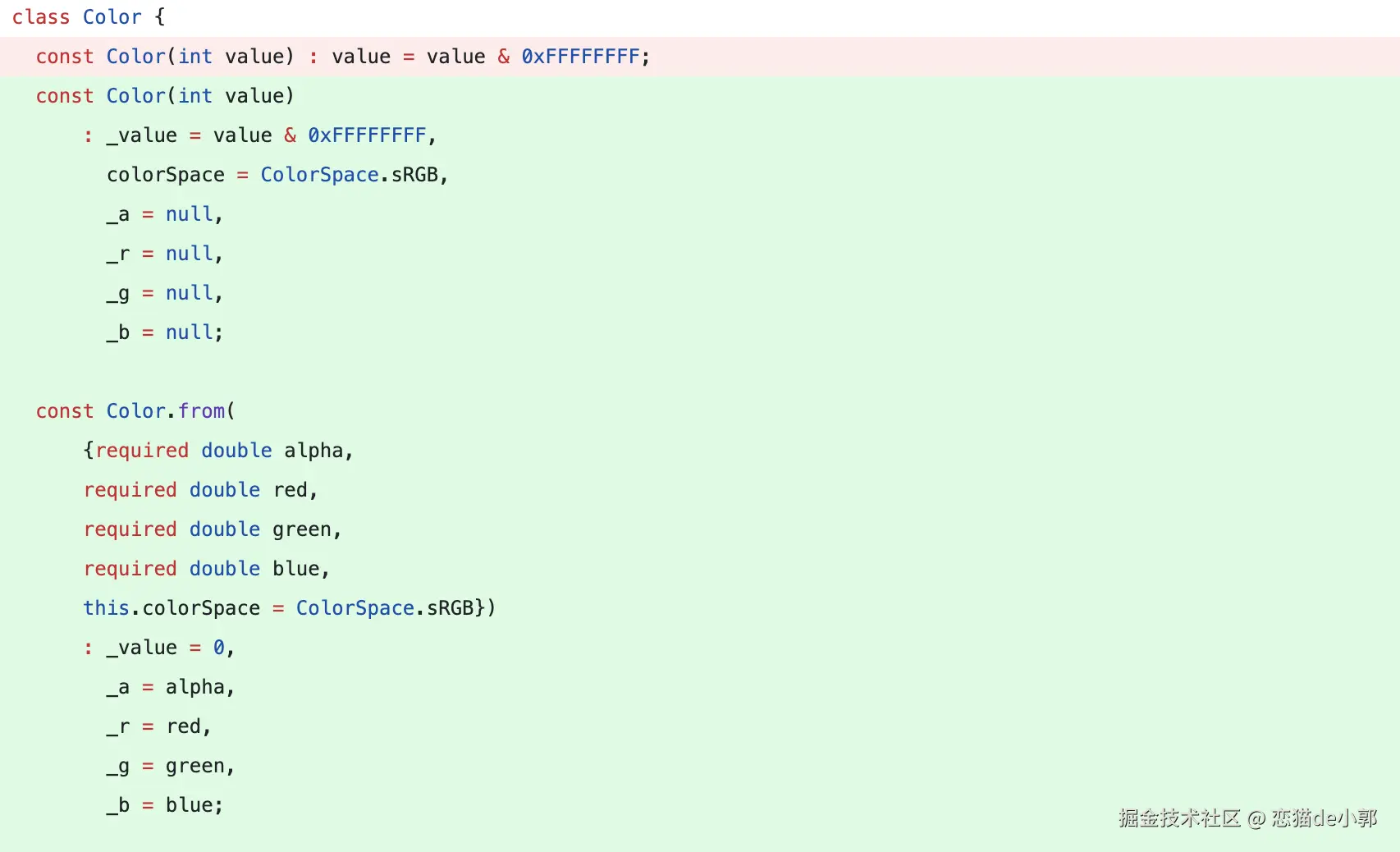 所以 Flutter Team 在 2023 年开启了重构 Color 对象的提案,让 Color 也调整为支持 P3 广色域的能力,最直观的就是,原本参数的有效范围 [0, 255] 的整形,而现在颜色分量调整为 [0,1.0] 的浮点。