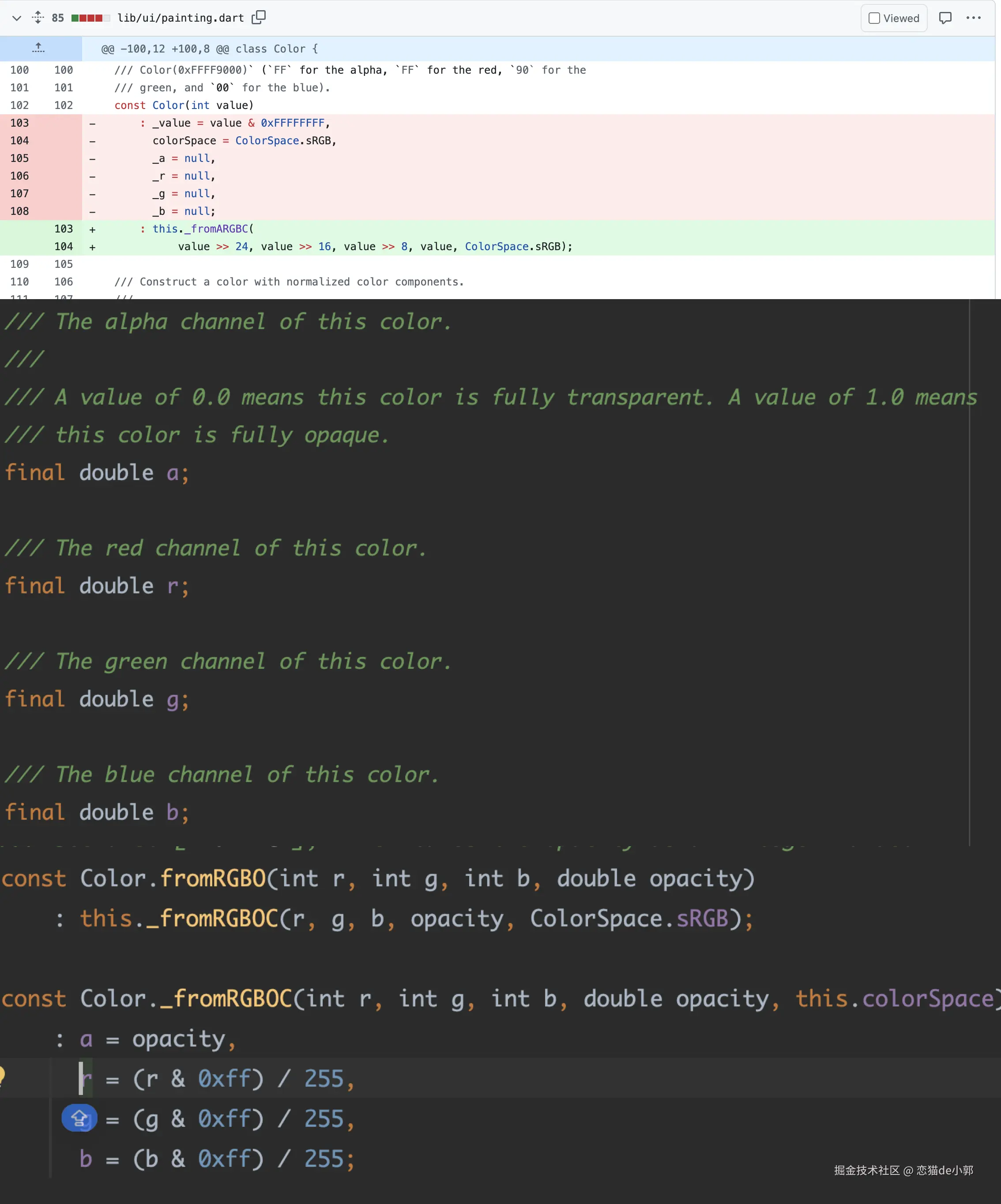 在此之前,整形的 [0, 255] 颜色也就是每个颜色只有 8 位,从 Dart 层传递到引擎的方式是:ARGB(4x8) 被打包成一个 32 位 alpha-red-blue-green 的 Dart 整数 ,每个 color 有 8 位(255),之后 color 会被转化为 Skia 的