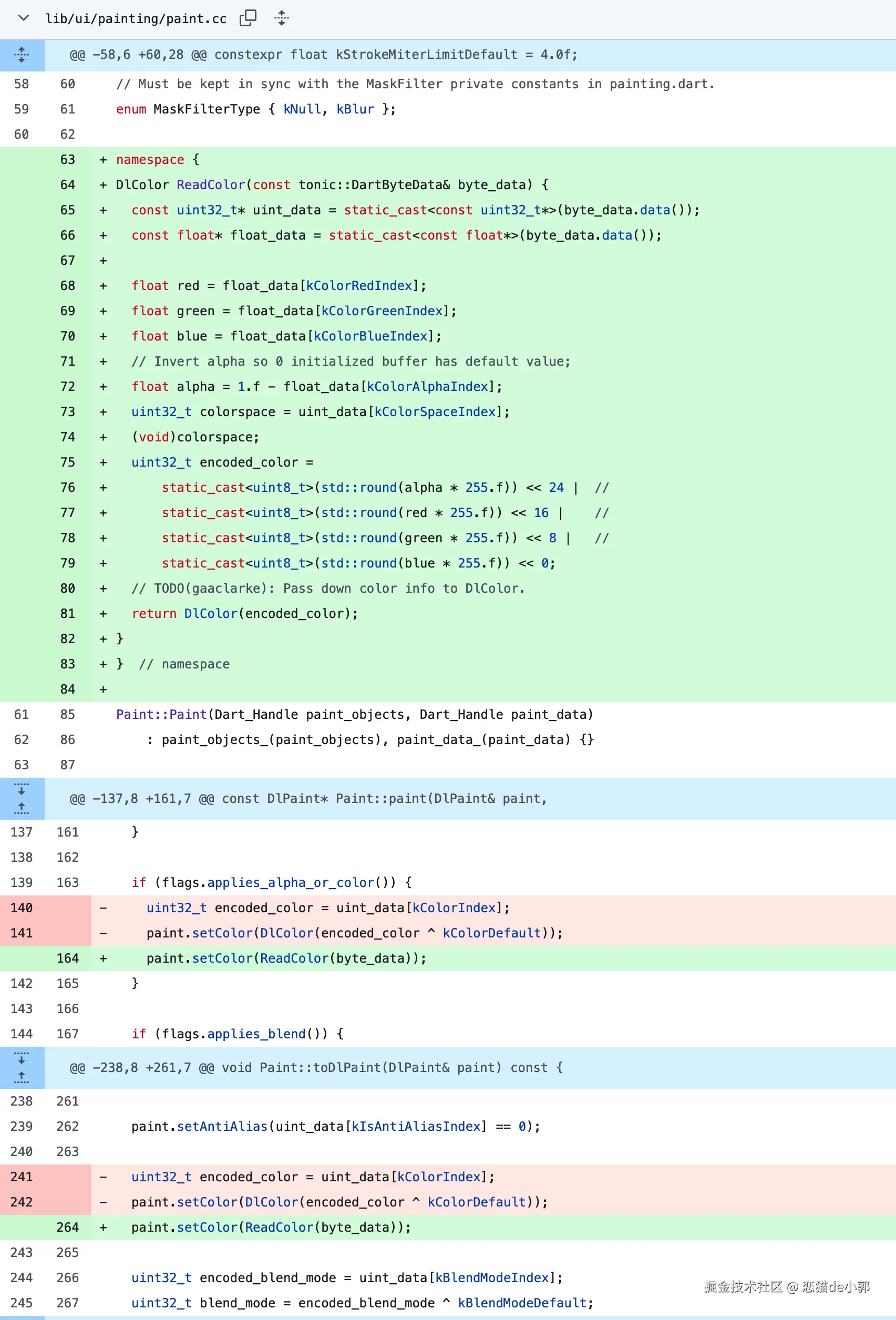 之后,组件将颜色的 TypedData 发送到 C++,而前面说过,在 Engine 层的 DlColor 也调整到 128 位适配 impeller::Color , 也就是 DlColor 是 4 个 32 位的 float 组成,同时往后兼容 sRGB 色彩空间。