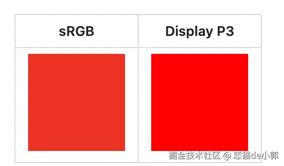 那么实现 sRGB 和 P3 有什么区别?简单来说,最直观的感受就是如下图所示的区别,在具备 P3 色域的设备屏幕上, P3 拥有更广的色域,所以可以看到更鲜艳的颜色,而在如今 2024 来看,其实大部分移动设备都已经具备了 P3 色域的硬件支持。
