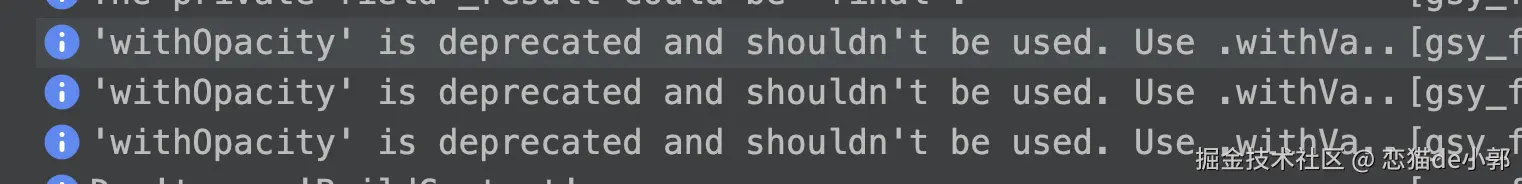 另外,在以前 Color 具有 “opacity” 的概念,所有会有 opacity 和 withOpacity() 的存在,以前引入 Opacity 是为了让 Color 具有浮点的 alpha 通道,而现在 alpha 是一个浮点值,所以 opacity 显得多余,未来opacity 和 withOpacity 已被弃用并计划删除: