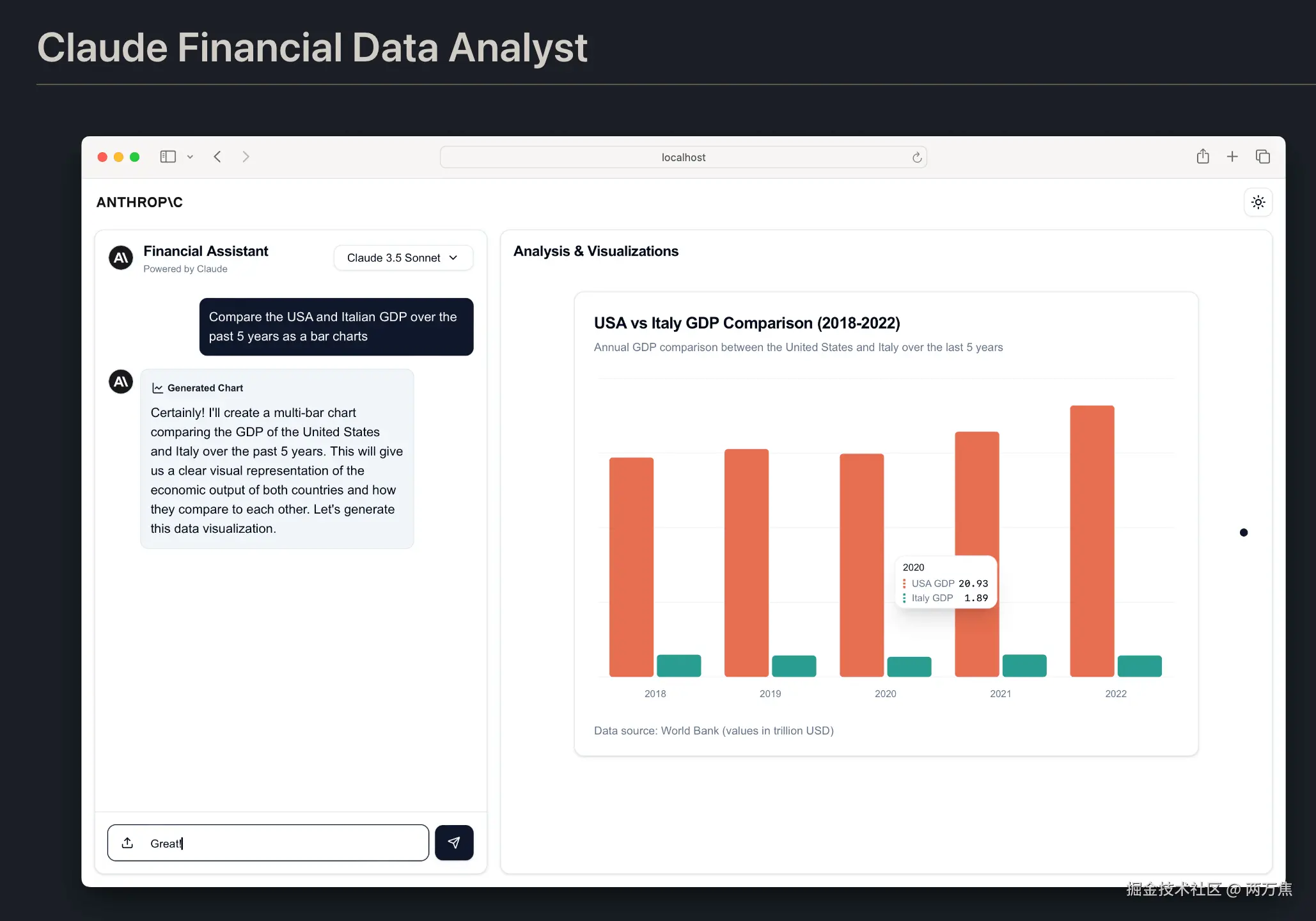 - Claude Financial Data Analyst:基于 Claude 的金融数据分析师,上传文档或图片生成好看的交互式可视化图表