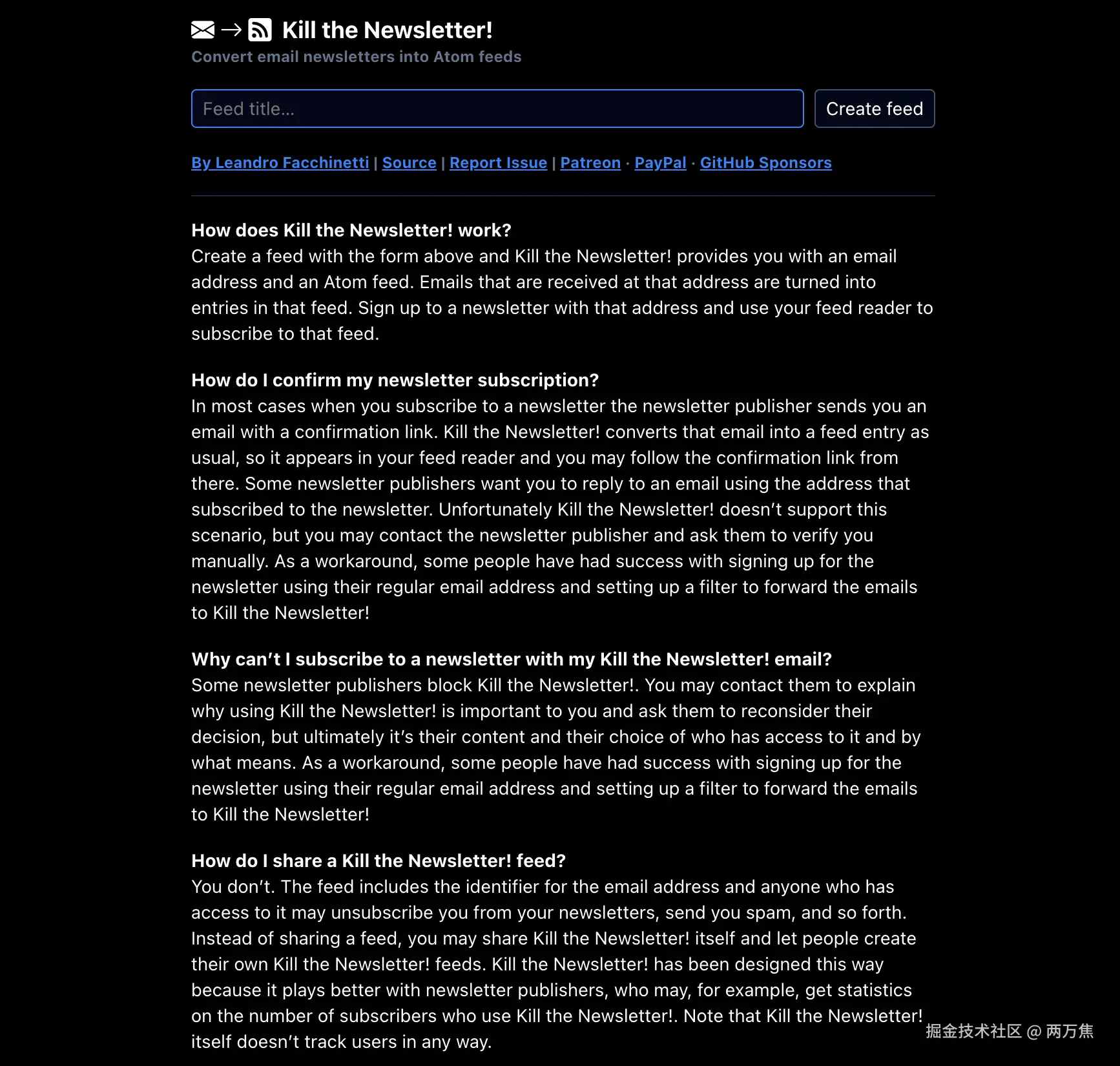 - Kill the Newsletter:一个将邮件订阅转换为 RSS 的工具,通过创建一个临时邮箱,将自己订阅的邮件转化为 RSS Feed,这样可以使用 RSS 阅读器统一阅读,相当方便