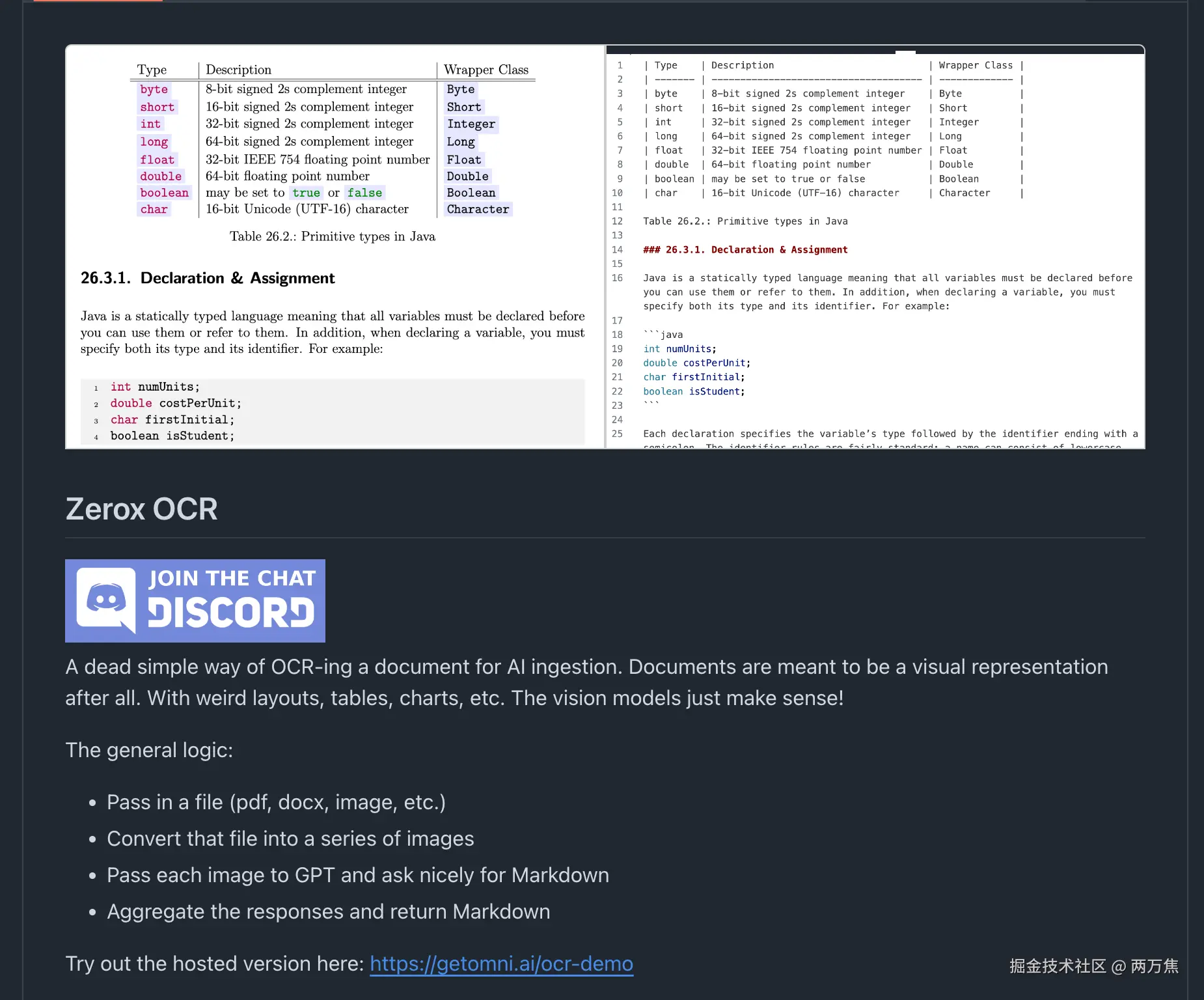 - zerox:一个开源的 OCR 工具,通过 AI 将 PDF 信息转换为 makedown 或者是 json 格式,从图片效果来看识别的很精准