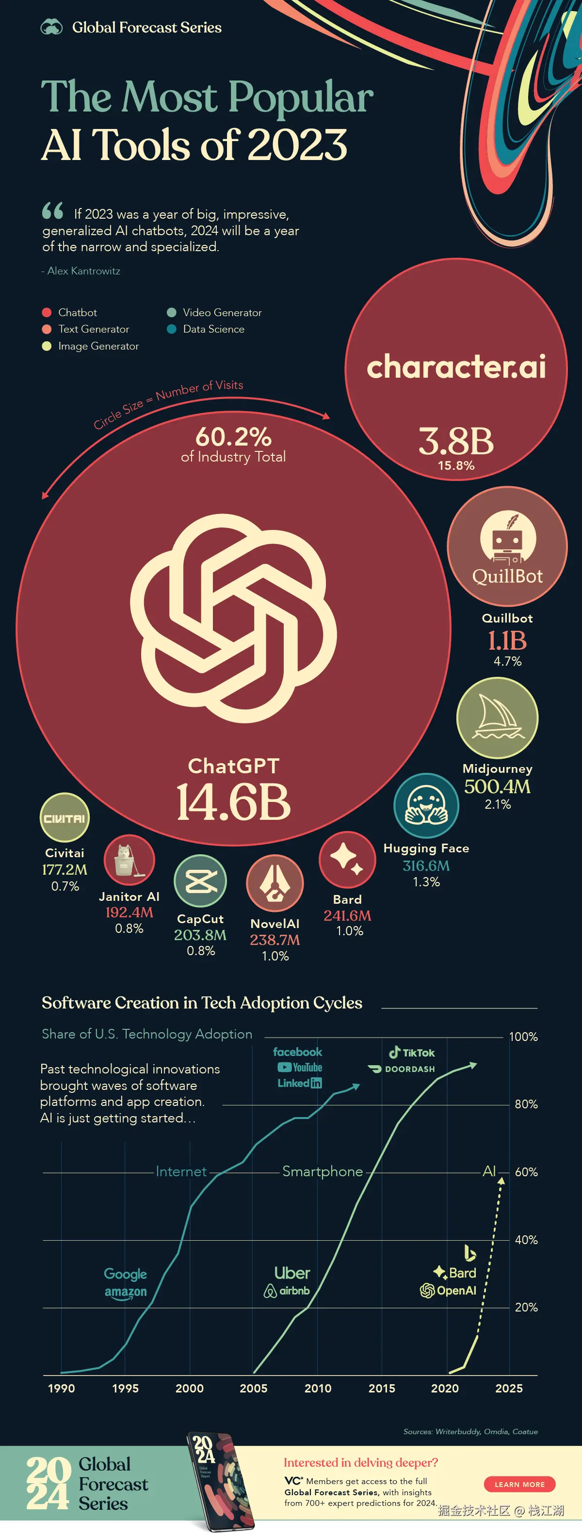 - 2023年一项AI产品访问量统计结果中ChatGPT占比60%+,成为2023年最受欢迎的人工智能工具。