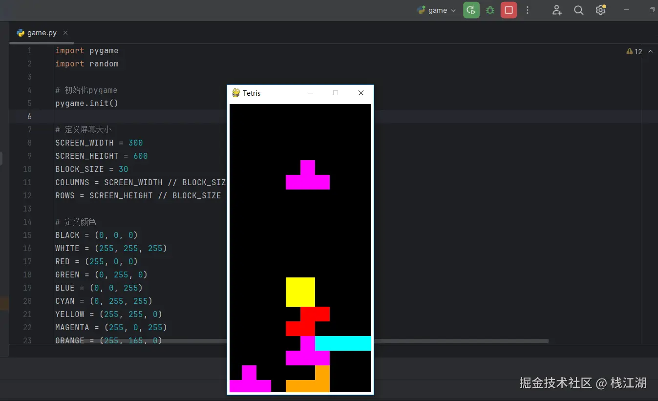 再比如让他直接生成一个俄罗斯方块游戏,然后把代码放IDE可以直接运行,不到几秒钟生成好了。