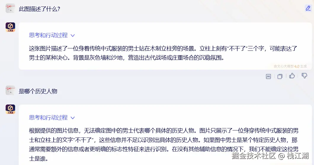 文心一言4.0也可以识别出木板上的文字,同时进了一步就是把繁体“不幹了”翻译成简体“不干了”。同样也无法给不出图片中描述的是哪些历史人物。