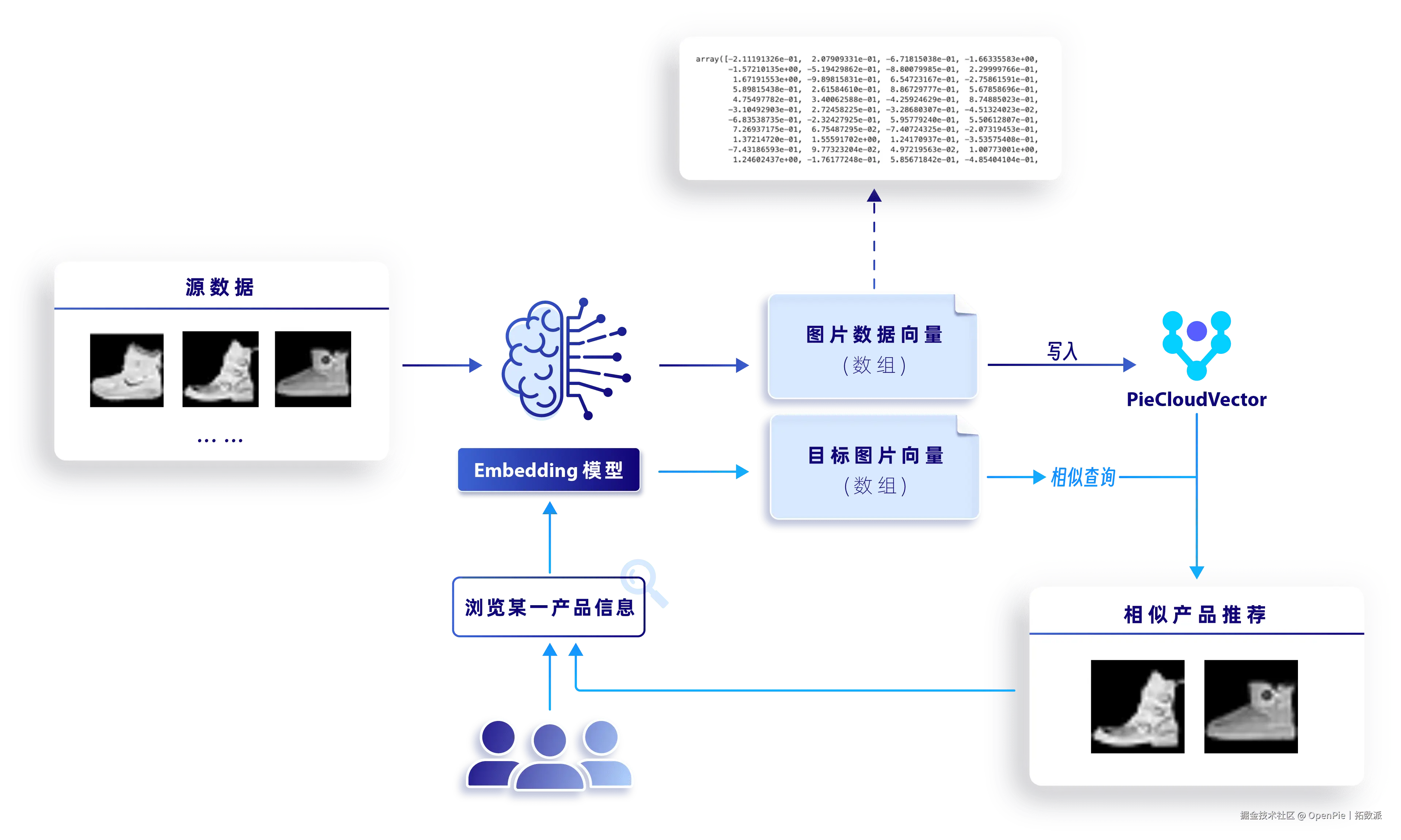 接下来,本文将从「数据集准备」、「数据向量化处理」、「向量数据存储」以及「相似性搜索」四个关键环节,详细阐述利用 PieCloudVector 搭建商品推荐系统的整个流程。