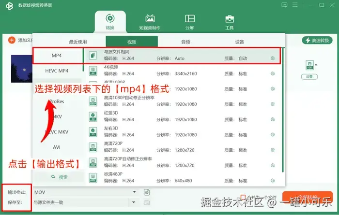 步骤2:点击【输出格式】,打开音视频格式列表,选择视频列表下的【mp4】格式。