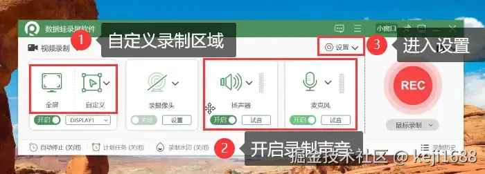 步骤2:在常用的【视频录制】模式中,我们可以自由选择录制区域并开启录制声音。需要更多自定义的需求可以进入【设置】中进行免费的调整,调整完毕后点击【REC】进行录制。
