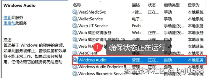 如果以上方法均无法解决问题,电脑没有声音怎么回事?我们还可以通过【Win+R】打开【运行】页面,输入【services.msc】并回车打开【服务】窗口。找到【Windows Audio】服务,确保该服务已启动且状态为【正在运行】。