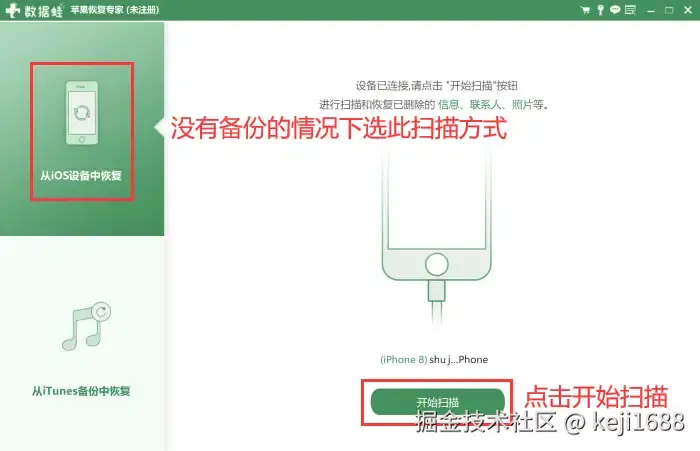 步骤1:将苹果手机连接到电脑上并启动苹果恢复专家。没有备份的备忘录恢复我们选择【从iOS设备中恢复】模式,然后直接点击【开始扫描】按钮。