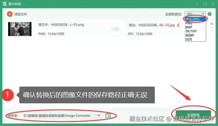 在成功添加图像文件之后 (您也可以通过点击界面左上方的【添加文件】按钮来批量上传并选择需要转换的文件) ,在jpg格式图片转换器的右上角选择 【JPG/JPEG】 作为目标格式。在确认转换后的图像文件的保存路径正确无误之后,点击界面右下方的 【全部转换】 按钮以开始转换过程。