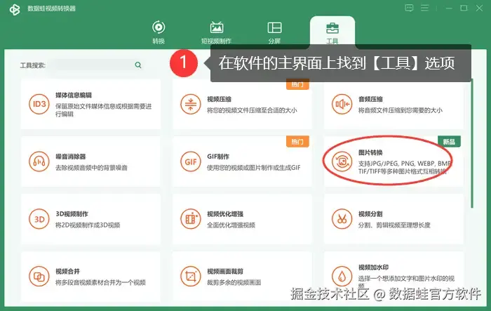 启动 【数据 蛙视频转换器】 后,首先在软件的主界面上找到右上角的 【工具】 选项。接着,从弹出的菜单中选择 【图片转换】 功能。