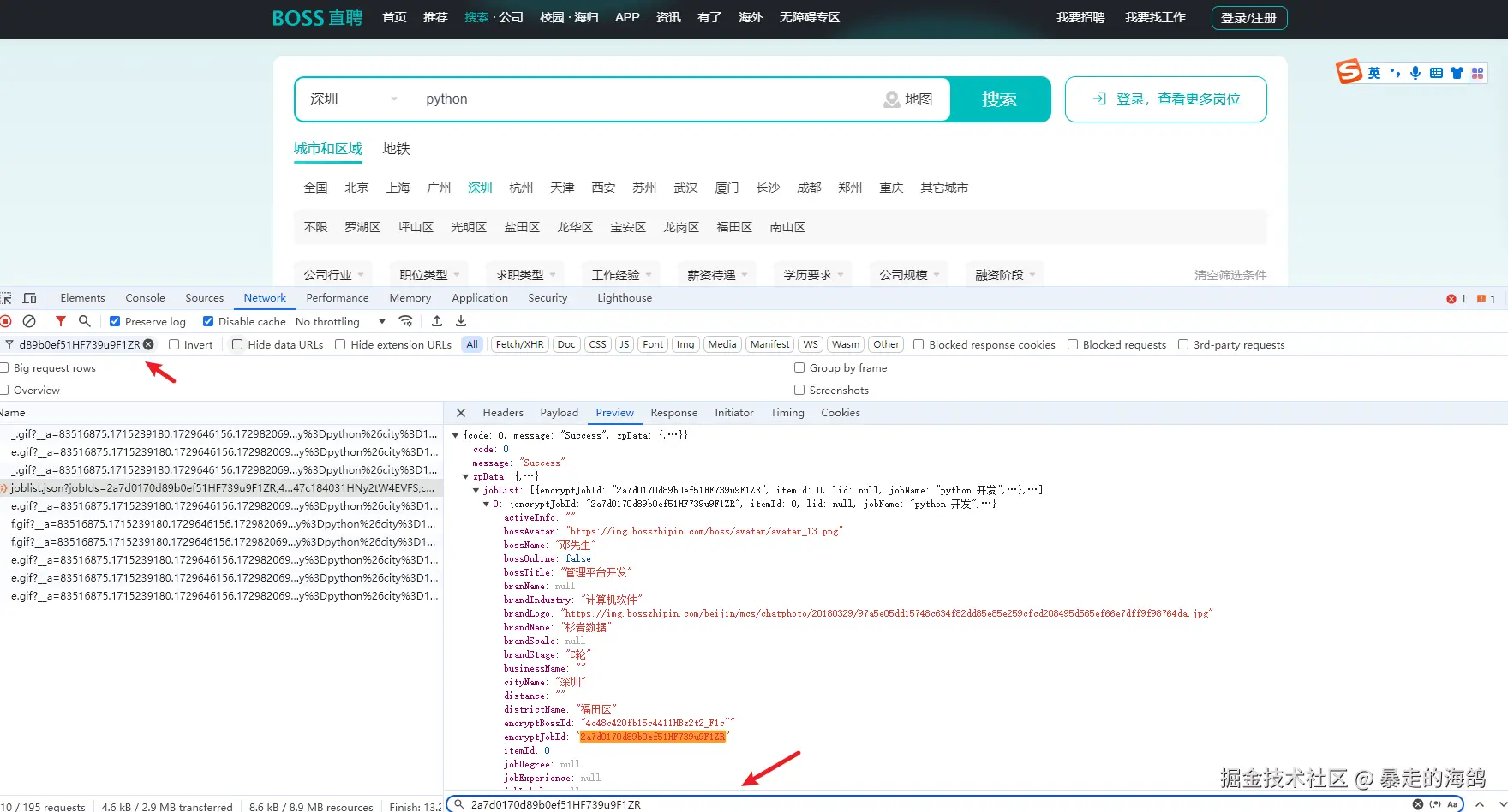 首先,我们打开 Boss 直聘首页,F12 打开开发者模式,选择好城市(如深圳),随便搜索一个职位(如python):