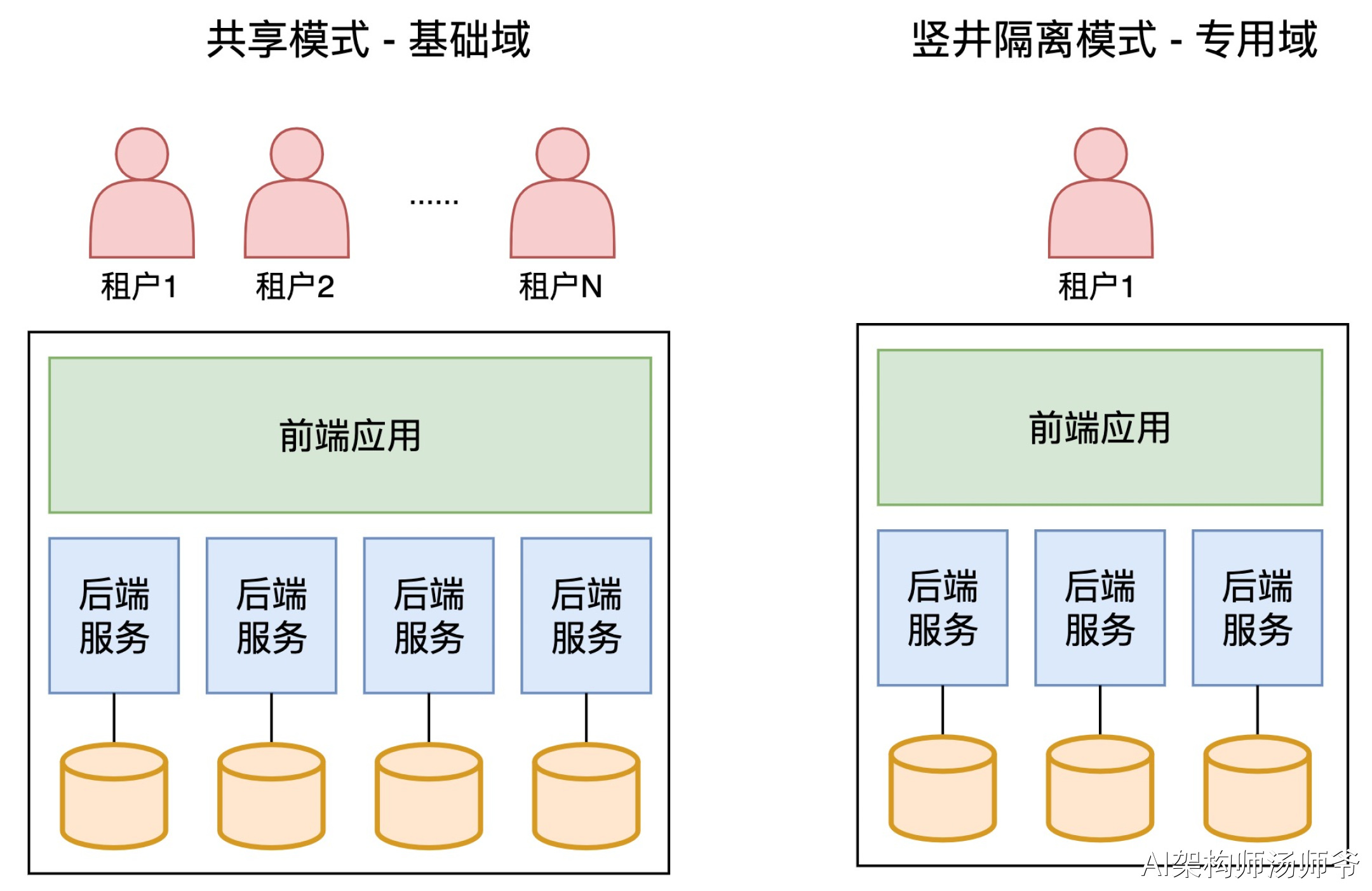 在这种模式下,将资源细分为基础域和专用域:基础域使用共享模式,所有租户共享一套资源;专用域则采用竖井模式,每个租户拥有独立的资源环境。