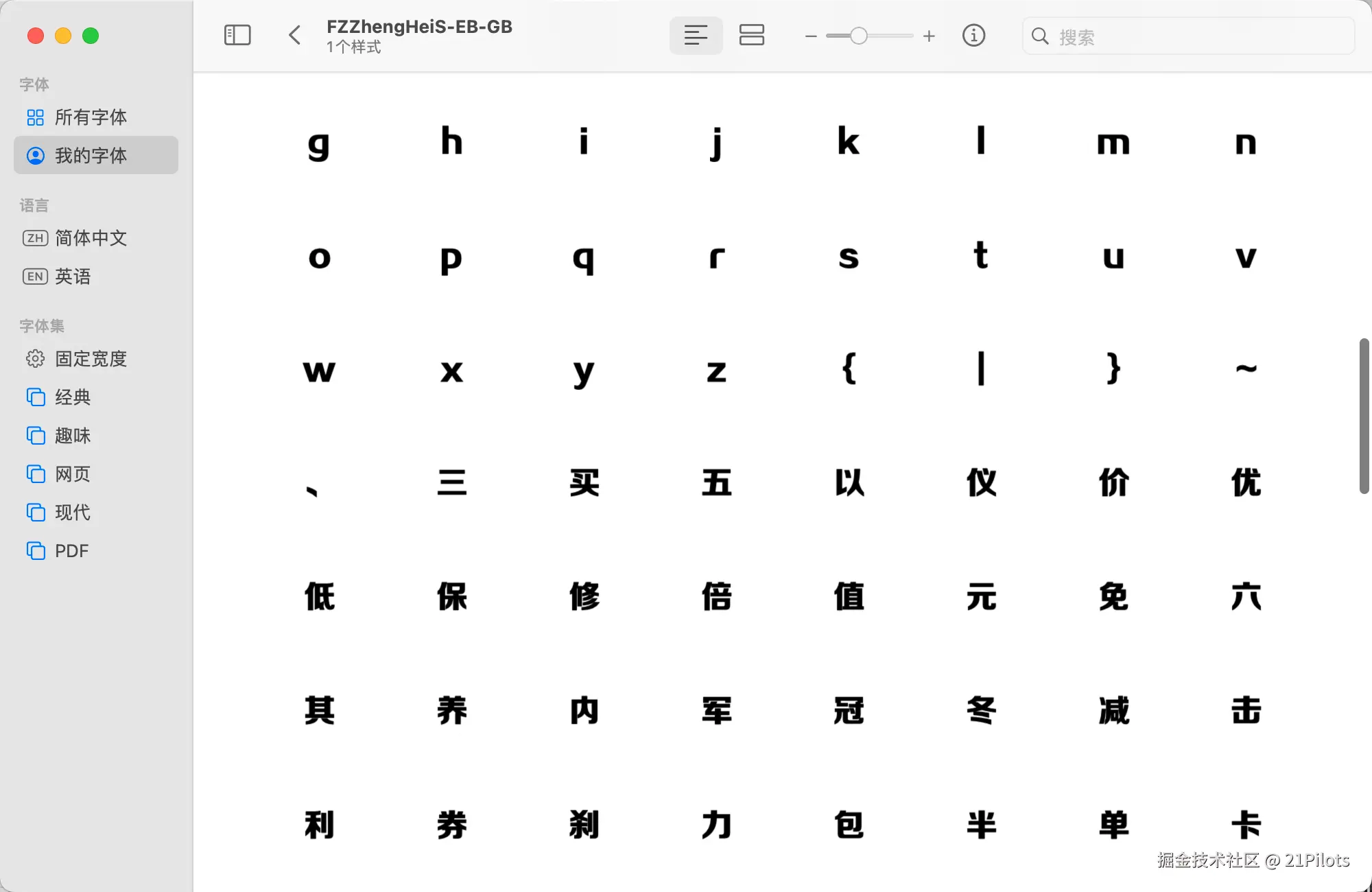 Glyph 对象是字形的一组属性集合,glyph 为单个需要渲染的字形,是渲染的最小单位。字形是通常与字符相对应的单个标记。一个抽象字符可能有多种形状(字形),但由于都具有相同的含义,在 Unicode 中被视为同一个字符,只会分配一个码点,比如汉字有楷、行、草、隶等写法,这些属于同一个字符的不同字形。所以我们拿到 Unicode 唯一编码即可,然后和我们需要校验的字符的 Unicode 编码进行比较。