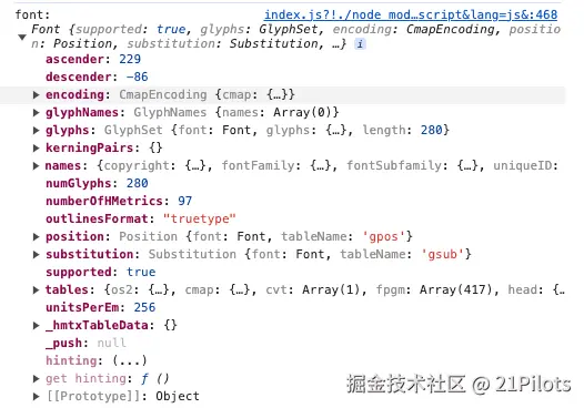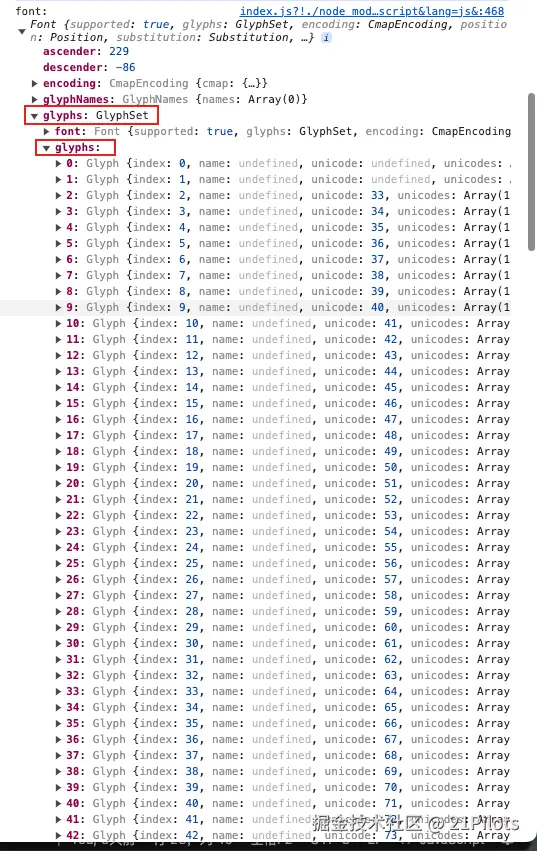 在此对象中,我们能拿到所有字符的字形表,即由所有字符组成的 Glyph 对象集合(GlyphSet)。