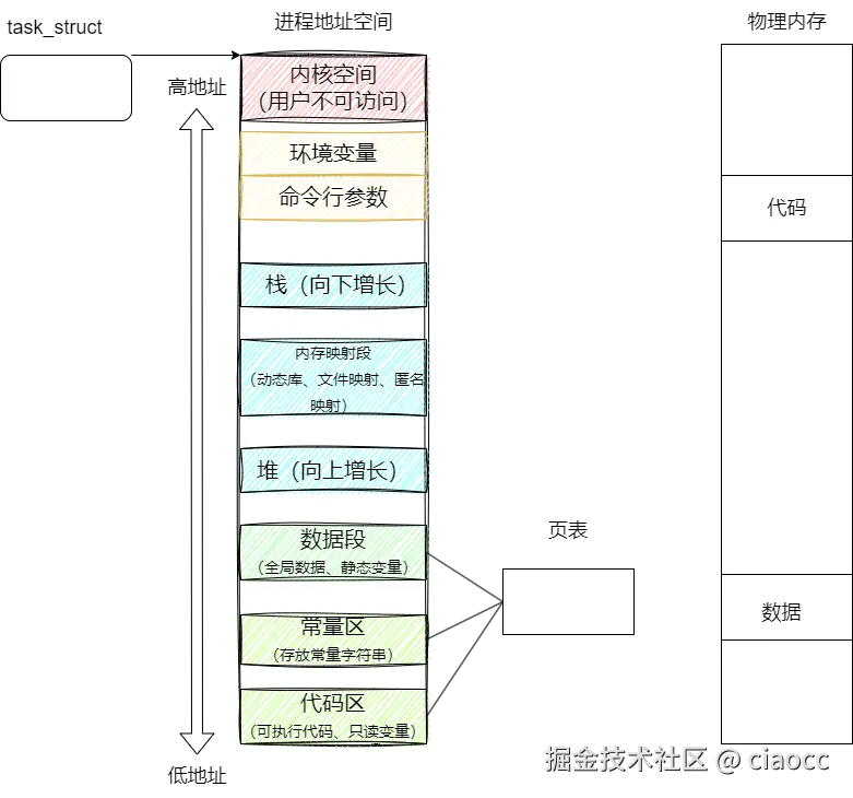 讲解进程的时候我们说过,进程 = 代码 + PCB + mm_struct + 页表 + mmu + 物理地址,如下: