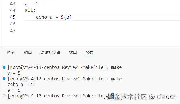 可以看到在第三行添加了"@"后,make执行的结果中本条命令就不可见了,去掉"@"后就会显示本条命令。