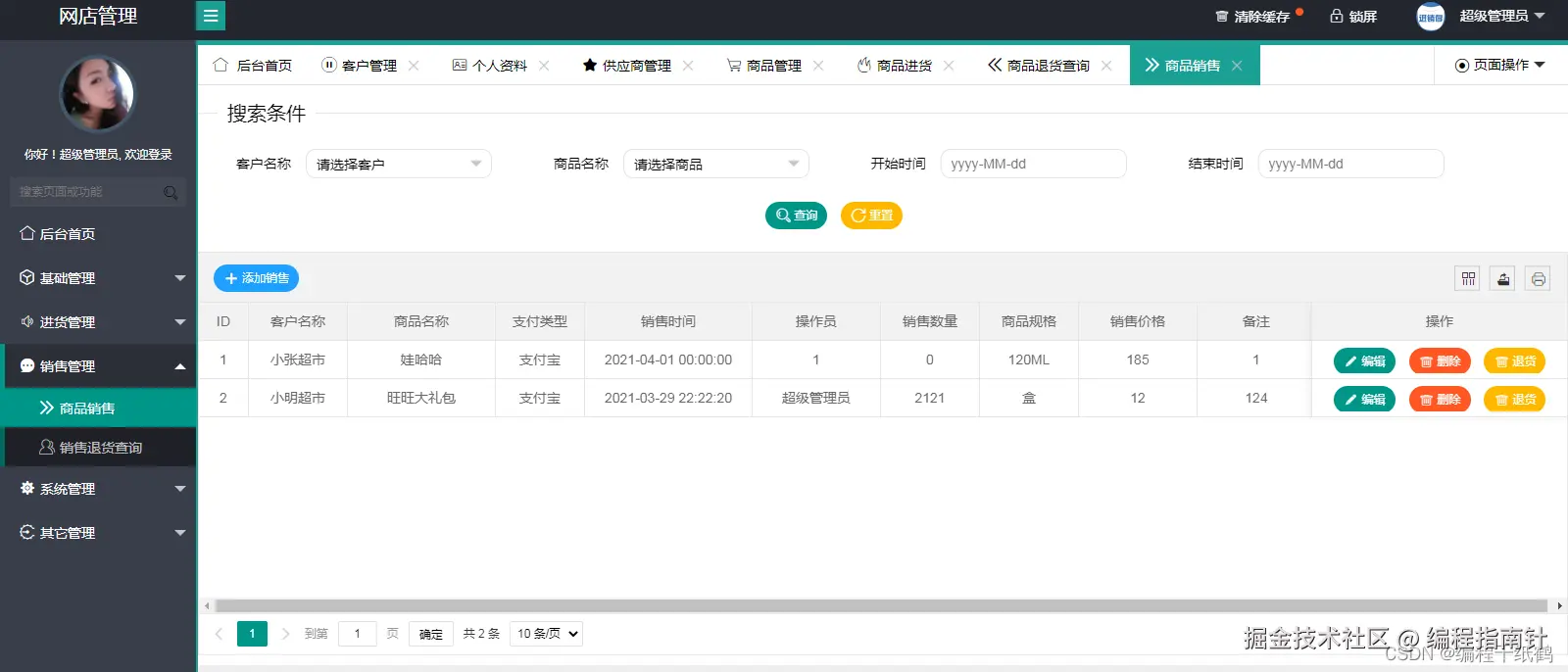 - 销售管理:包含商品销售、退货、销售退货查询几个子查块