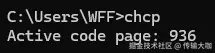在Windows cmd中,使用chcp命令可以查看当前控制台使用的代码页: