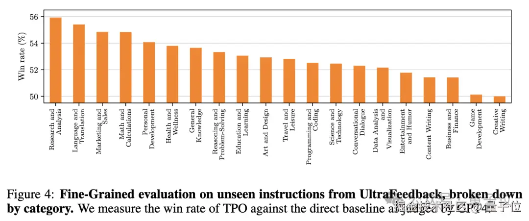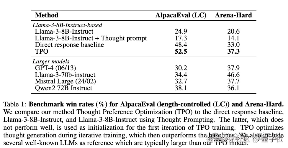 在 AlpacaEval 基准测试中,TPO 模型获得 52.5% 的胜率,比基线提升 4.1%;在 Arena-Hard 测试上,TPO 模型获得 37.3% 的胜率,比基线提升 4.3%。