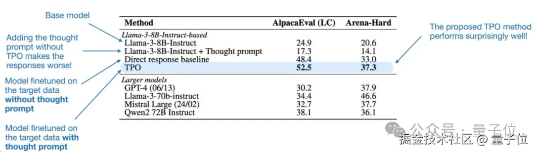 有意思的是,如果添加了思维提示,但 Llama 3 8B Instruct 基础模型没有在偏好对上经历 DPO 微调,那么这个基础模型的性能会比没有思维提示时差得多。