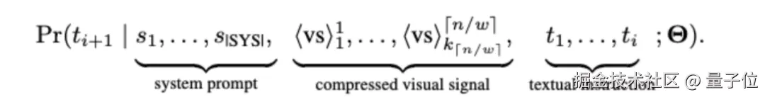 Video-XL 通过优化在压缩视觉信号下的生成质量来进行训练。下一个 Token 的预测通过以下公式进行计算: