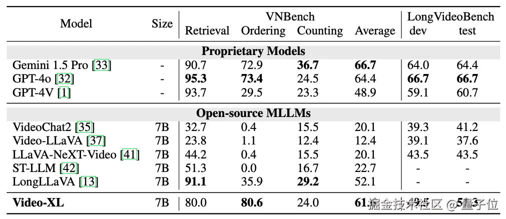 如表一,表二所示 Video-XL 在多个主流的长视频评测基准上展现了卓越性能。其中在 VNBench 上准确率超过了目前最好的长视频模型大约 10%。