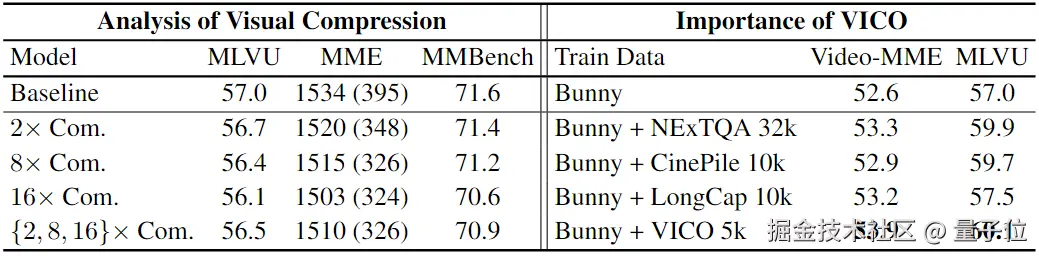 Video-XL 对所提出的视觉压缩机制和 VICO 数据集进行了消融实验,如表三所示