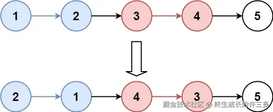 end指针向前移动k个节点,检查是否能够找到k个节点。如果链表剩余部分不足k个节点,则无需再进行翻转,直接返回哑节点的下一个节点(即原链表的头节点)。否则,进行下一步。 - 翻转子链表:确定了要翻转的子链表区间后,使用一个辅助函数(如上面的