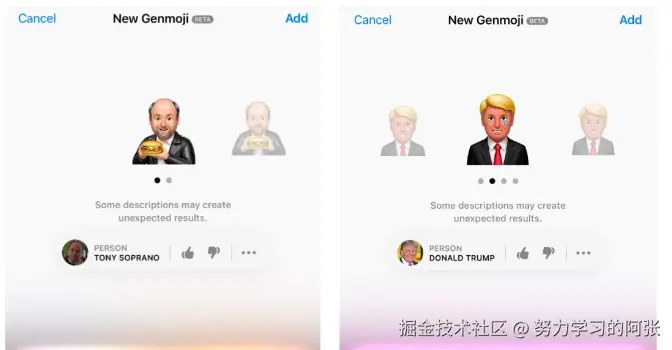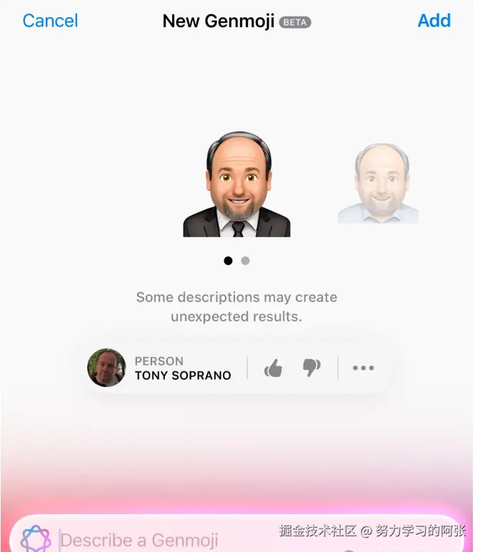 基于人物的Genmoji,用户还可以进一步输入提示词来创建更多的Genmoji。
