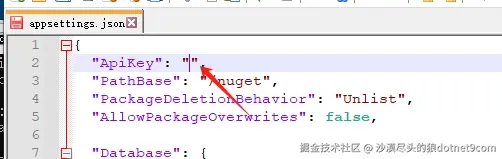 上面提示NuGet服务配置了密钥,我们为了简单,先停止NuGet服务,打开它的配置文件appsettings.json,清空ApiKey节点值,再运行NuGet服务: