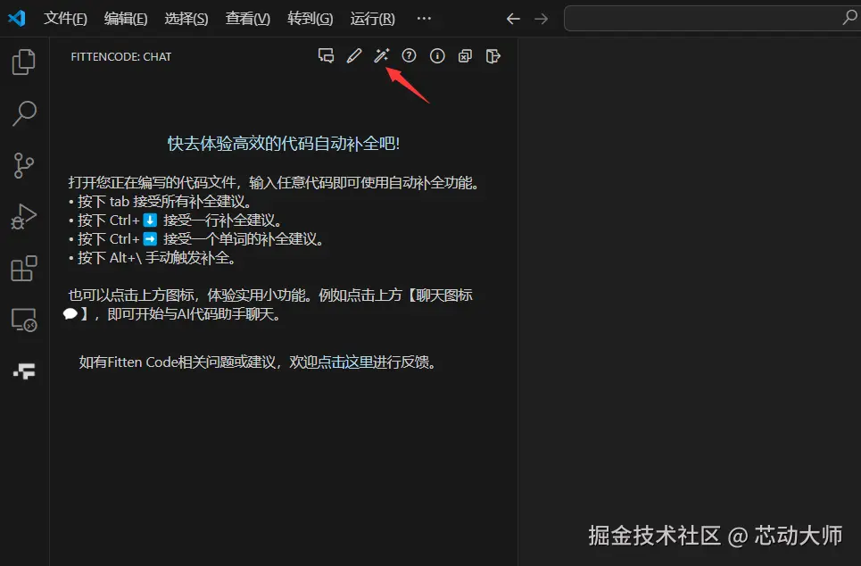 用户可通过点击左上角工具栏中的Fitten Code – 开始对话或者使用快捷键Ctrl+Alt+C(mac系统为Control+Option+C)打开对话窗口进行对话: