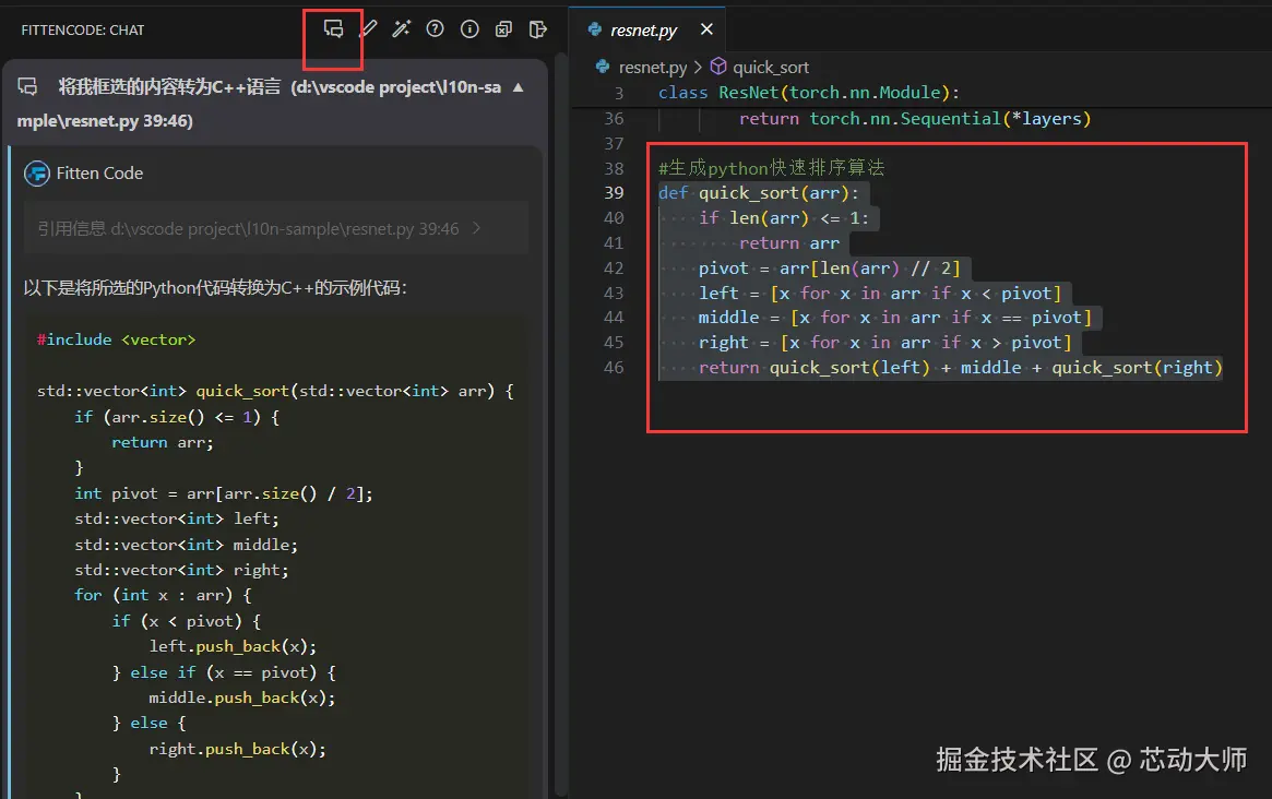 当用户选中代码段再进行对话时,Fitten Code 会自动引用用户所选中的代码段,此时可直接针对该代码段进行问询等操作: