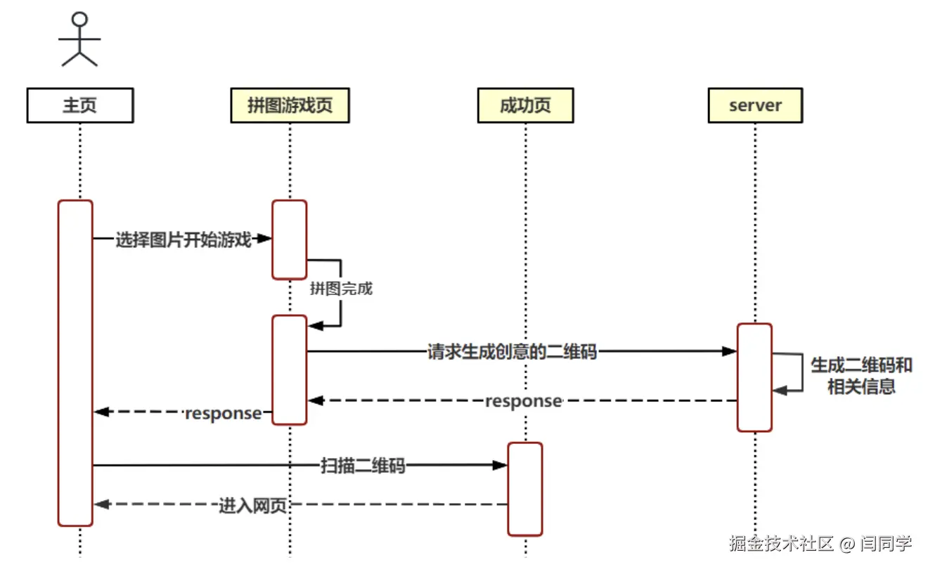 先看整个业务的流程图,游戏的核心就是拼图+二维码生成,拼图由前端实现,二维码则由后端实现: